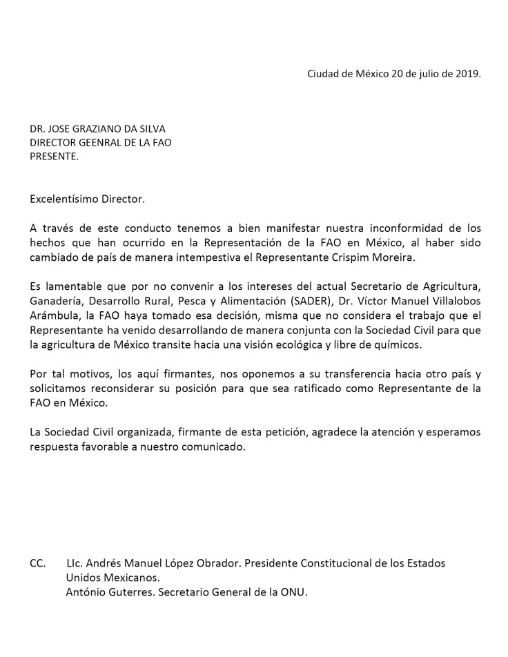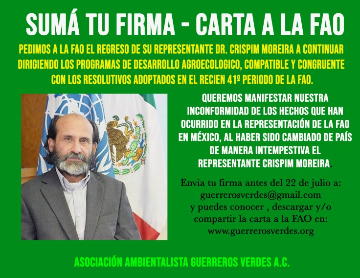 Nos enteramos de manera inesperada de que se esta removiendo a el Doctor Crispim Moreira encargado de la FAO en México, Representante de la Organización de las Naciones Unidas para la Alimentación y la Agricultura ONUAA, o más conocida como FAO. Tenemos la preocupación de que sea con intereses contrarios a la promocion y defensa de la agroecologia, de la salud pública a través de alimentación. El Doctor Crispim ha sido un defensor de la agroecología y por información de amigos y conocidos hemos confirmado su remoción a Jamaica.