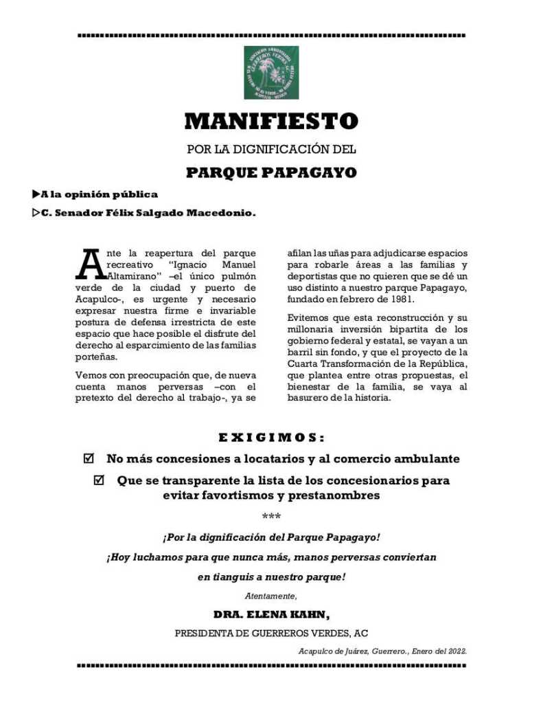 Ante la reapertura del parque recreativo «Ignacio Manuel Altamirano» -el único pulmón verde de la ciudad y puerto de Acapulco-, es urgente y necesario expresar nuestra firme e invariable postura de defensa irrestricta de este espacio que hace posible el disfrute del derecho al esparcimiento de las familias porteñas.