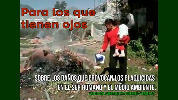 https://youtu.be/OWtgJ9lpfso Para los que tienen ojos Videodocumental de reflexión y análisis acerca de los daños que provocan los plaguicidas en el ser humano y el medio ambiente. Un material lamentablemente vigente por el uso devastador de estos venenos modernos. Directora Elena Kahn Realizador Antonio Arredondo Año 2007 México